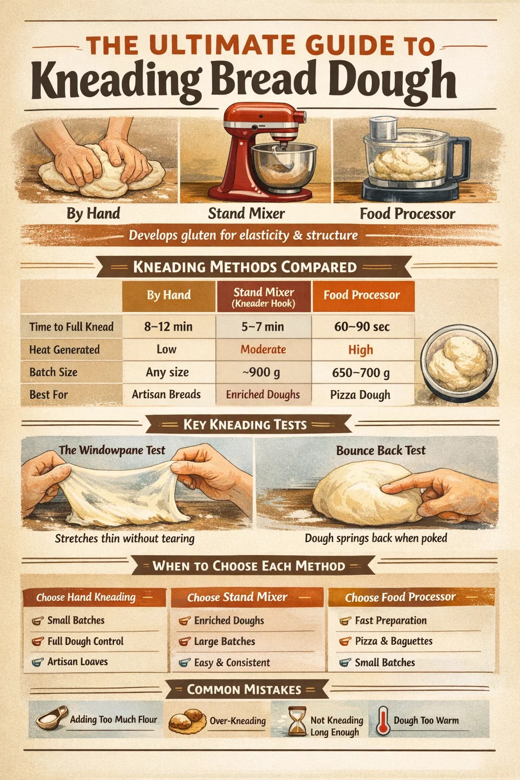 | Criteria | By Hand | Stand Mixer (Kneader Hook) | Food Processor |