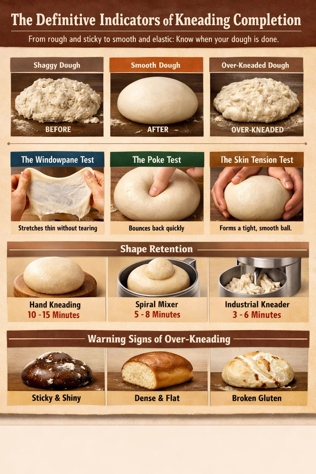 Instead of relying solely on a timer, which can be inaccurate due to humidity or flour protein content, use these physical benchmarks to verify the state of your kneaded material.