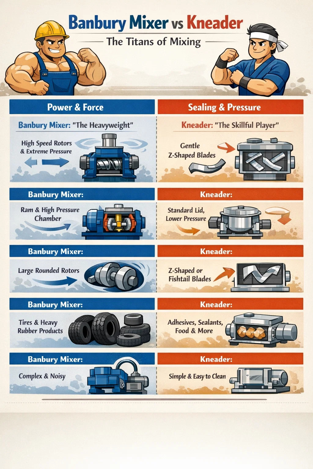In the world of rubber and plastics processing, **Banbury mixers and kneaders** are like two strongmen with different personalities. While both can uniformly mix viscous raw materials, they differ significantly in their working methods and power.